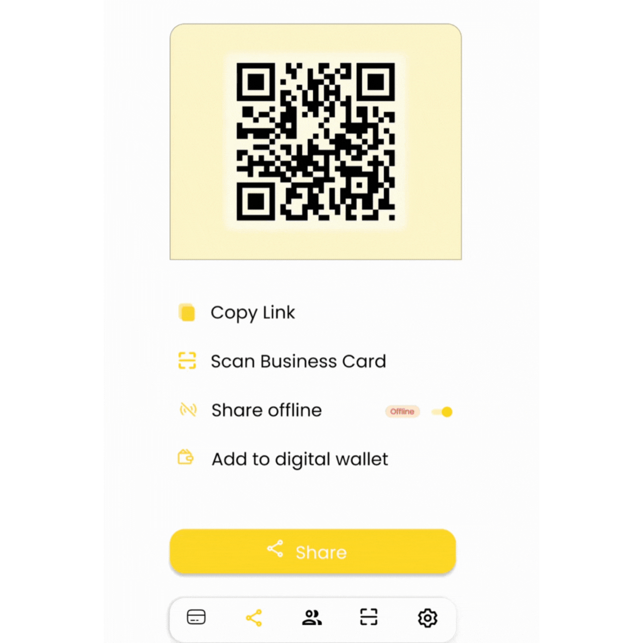 hare your card with anyone instantly through a tap, QR code, or link. No printing, no delays.