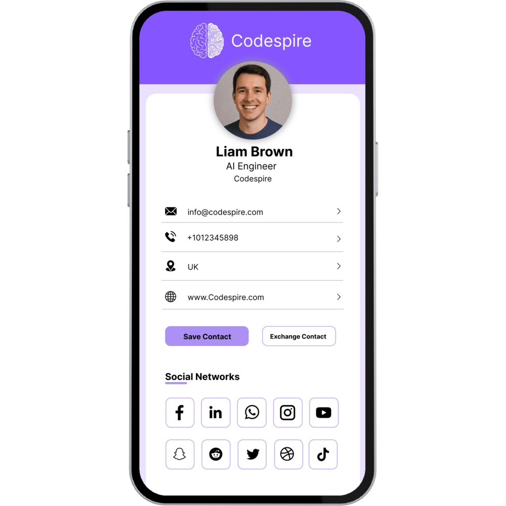 A digital business card is an online profile that stores your contact and professional information. It can be shared instantly using a QR code, NFC or a direct link.